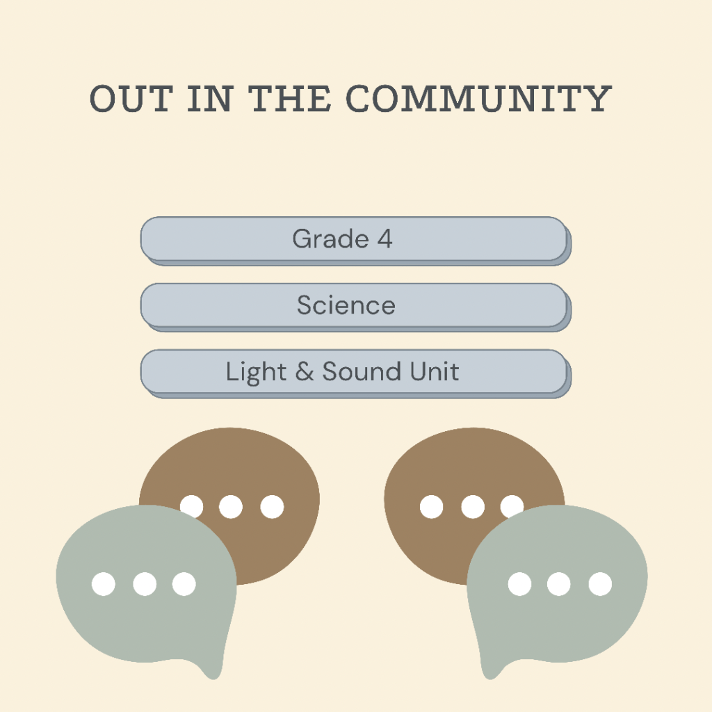 I have chosen to focus on Grade 4 Science: Light & Sound Unit for my Integrated Lesson Plan project. In this post, I will share how I will engage my students with the local community and enrich their learning in the classroom.