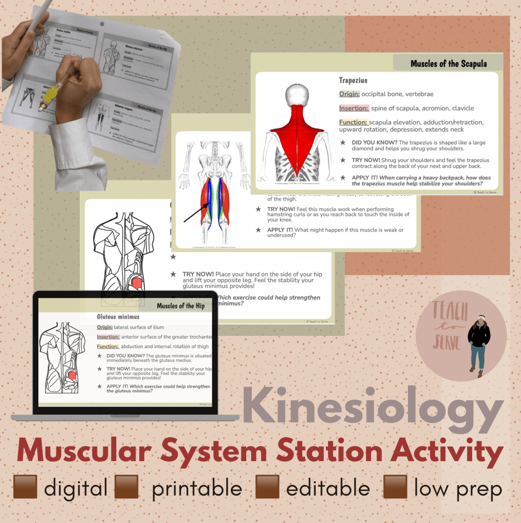 This station-based activity allows students to explore muscle origins, insertions, and functions at their own pace through interactive challenges and movement-based exercises. Perfect for self-paced learning.